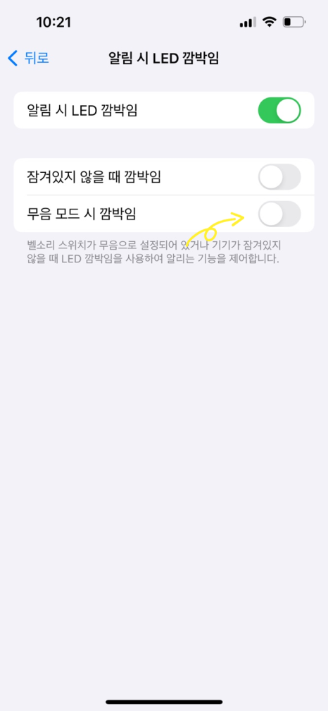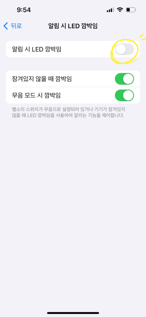 하단에 보이는 [알림 시 LED 깜빡임] 항목을 찾습니다. 기본 설정은 꺼짐 상태일 것입니다. 해당 항목을 터치하여 이동합니다.