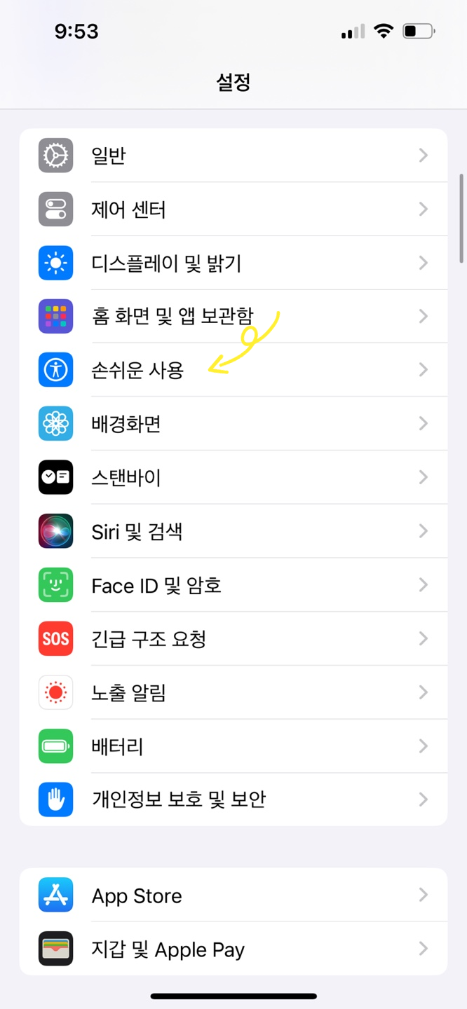 설정 메뉴에서 [손쉬운 사용] 항목을 선택합니다. 이 메뉴는 다양한 접근성 기능을 제공하여 사용자의 편의를 돕습니다.