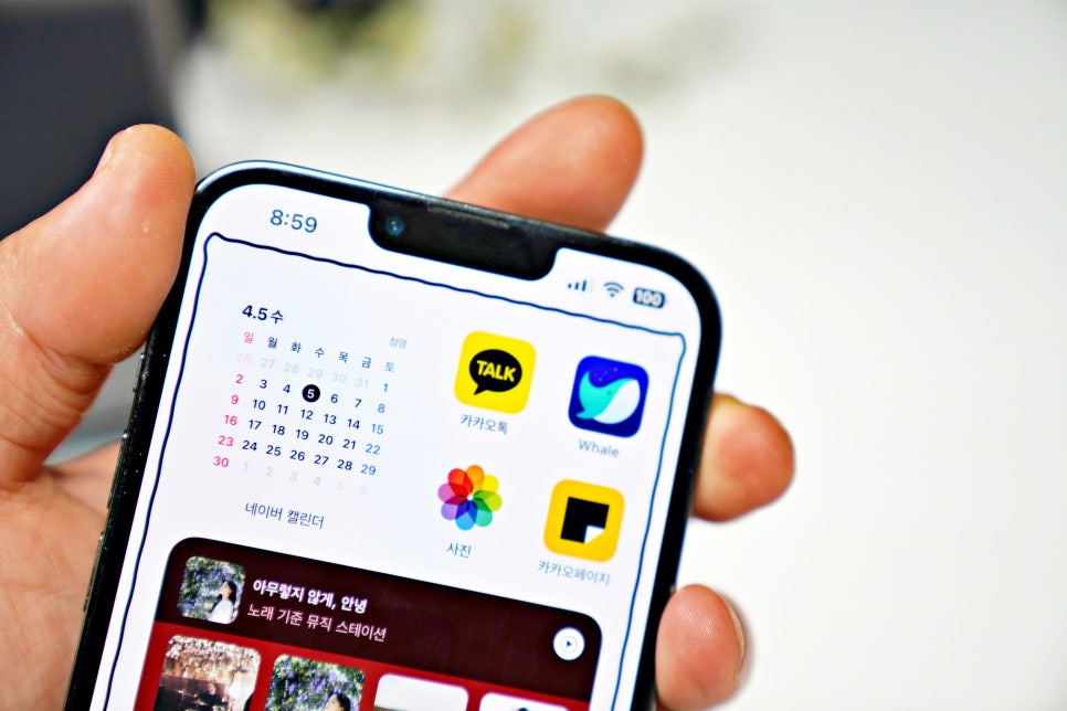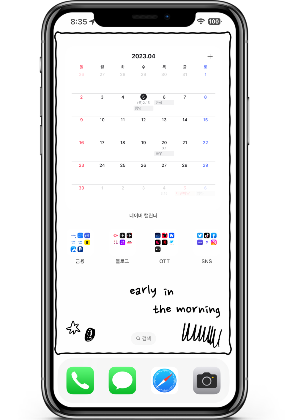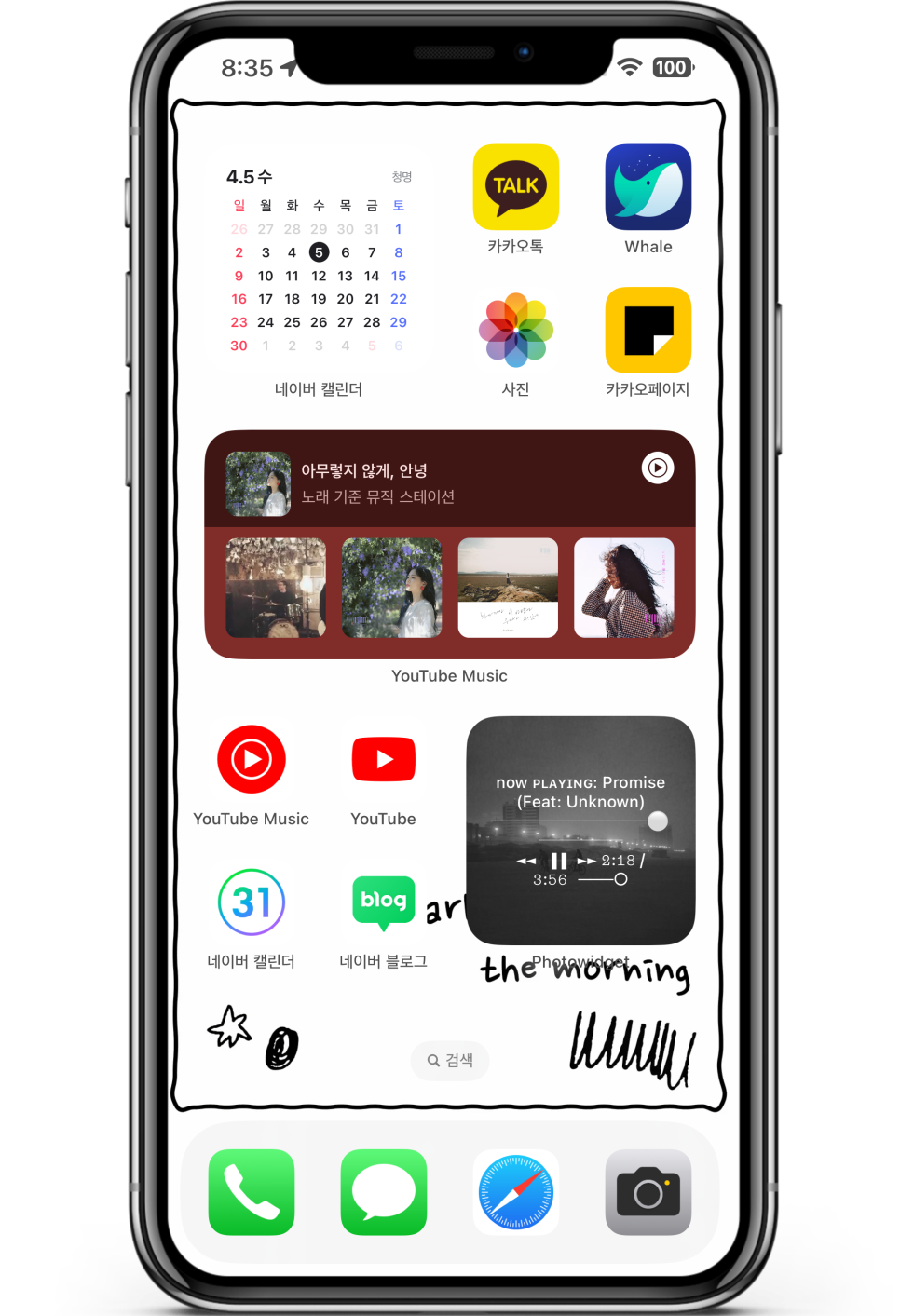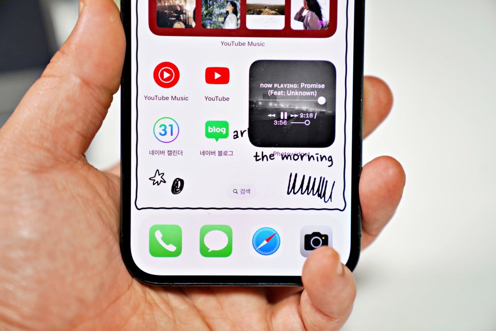 최근에 만들어본 아이폰 배경화면인데, 포토 위젯에 있는 테마를 참고해서 기본 위젯과 아이콘들을 적절하게 구성해서 만들어 보았다. 우측 하단의 빈 공간을 이미지로 채워 넣으면서 앱과 위젯 구성이 빈틈없이 배치되어 있다. 배경화면 꾸미기를 생각하면서 구상했던 홈 화면을 절묘하게 만들어냈다.