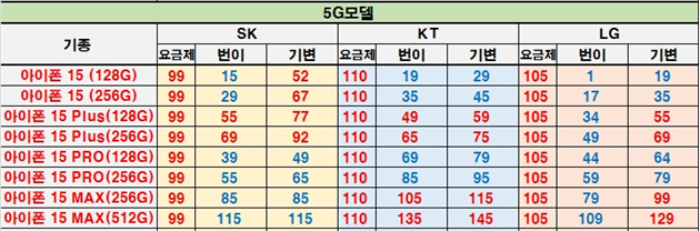 현재 아이폰15 공시지원금은 9~10만 원대 요금제 이용 시 SKT 42만 원 / KT 40만 원 / LG 45만 원씩 나와주고 있습니다.