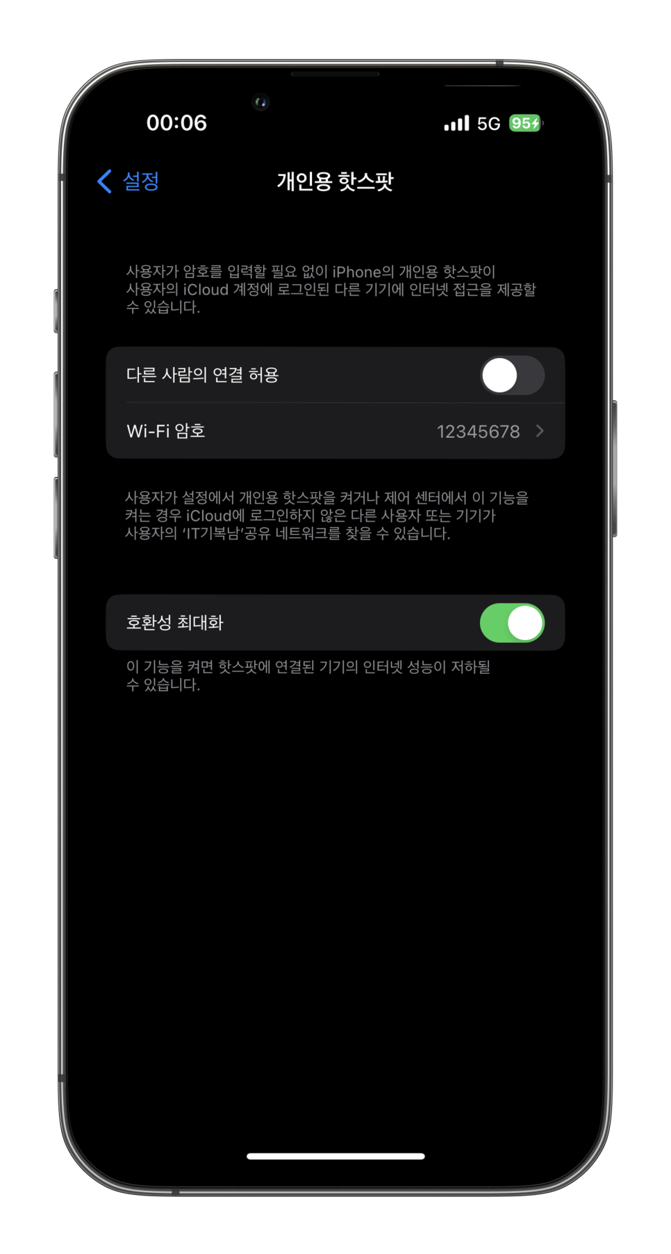 개인용 핫스팟 설정에서 확인해 보시면 가장 아래 호환성 최대화 메뉴 버튼이 있다. 아래 친절하게 설명을 보면 활성화를 하게 되면 연결된 기기의 인터넷 성능이 저하될 수 있다고 나와 있다. 연결이 되지 않는다면 끄고 다시 시도해 본다.