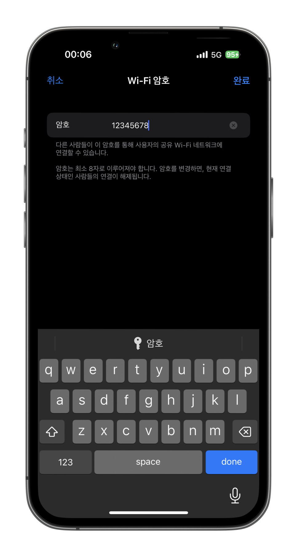 핫스팟 비밀번호는 8자리 이상으로 설정하셔야 하며 대, 소문자, 특수문자로 설정할 수 있다. 이렇게 기본적인 설정을 완료했다면 번거로운 터치를 하지 않고 제어센터를 통해서도 핫스팟을 설정할 수 있다.