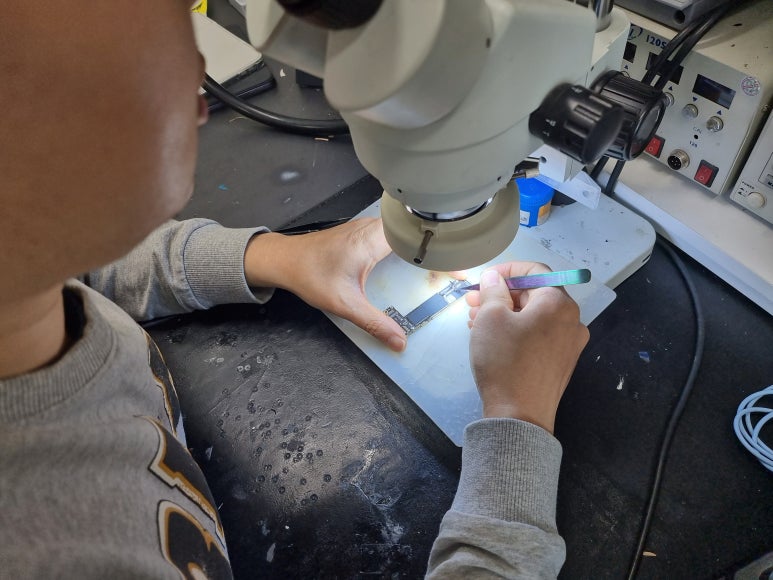 우선 액정을 여는 과정을 봤는데 현미경 같은 것으로 확인을 하시면서 장비를 이용해 분리를 하셨어요. 워낙 나사랑 부품이랑 작아서 제 눈에도 잘 보이지 않더라구요. 분리하는 과정이 생각보다 간단하지 않았고 이건 전문가의 영역이네요.