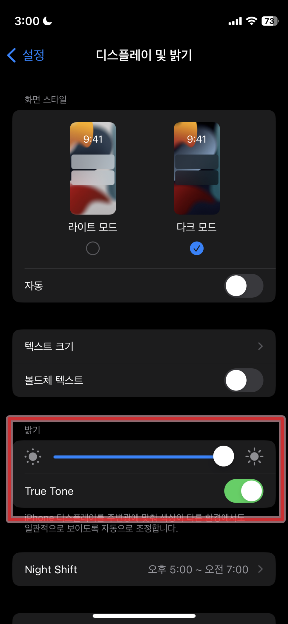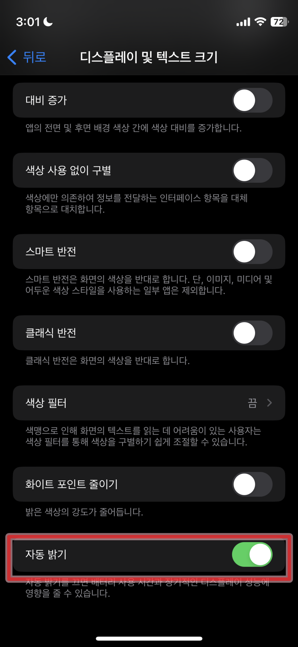아이폰 화면 자동밝기 기능을 꺼두면 디스플레이 성능과
