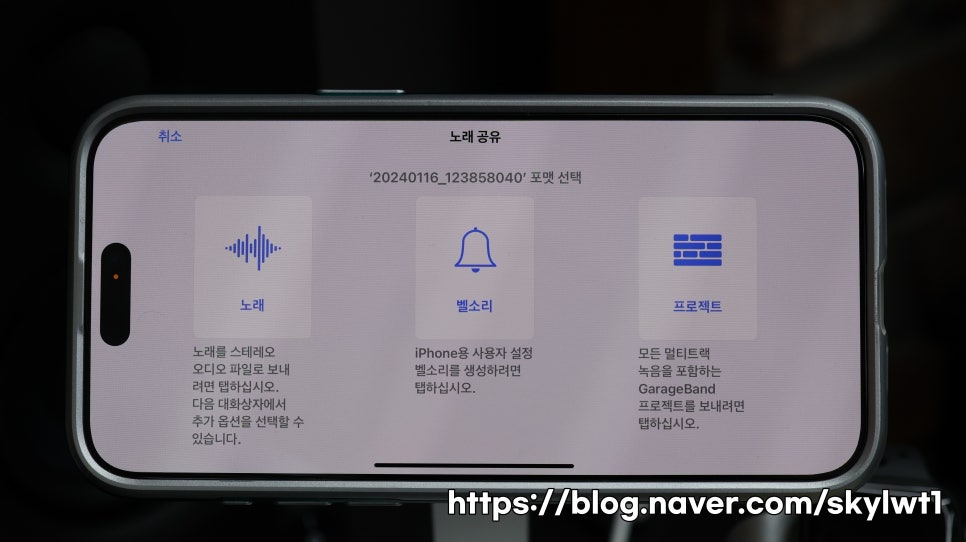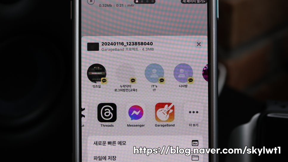 만들기 아이콘을 눌렀다면 하단에 공유 메뉴가 팝업이 되는데요? 이곳에서 GarageBand 앱을 찾아 선택합니다.
