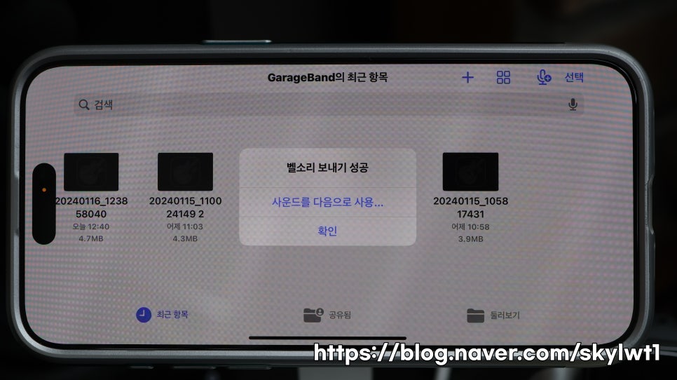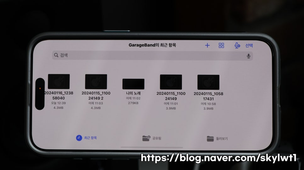 GarageBand 앱이 실행이 되었다면 좌측 첫번째에 조금전에 공유한 파일을 확인할 수 있습니다. 추출한 파일을 꾹 눌러주세요.
