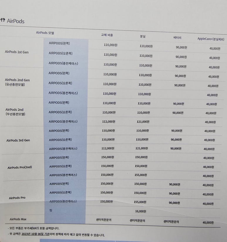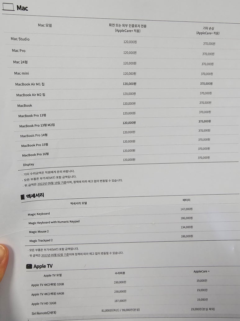 수리 비용 안내 책자가 있길래 찍어왔어요