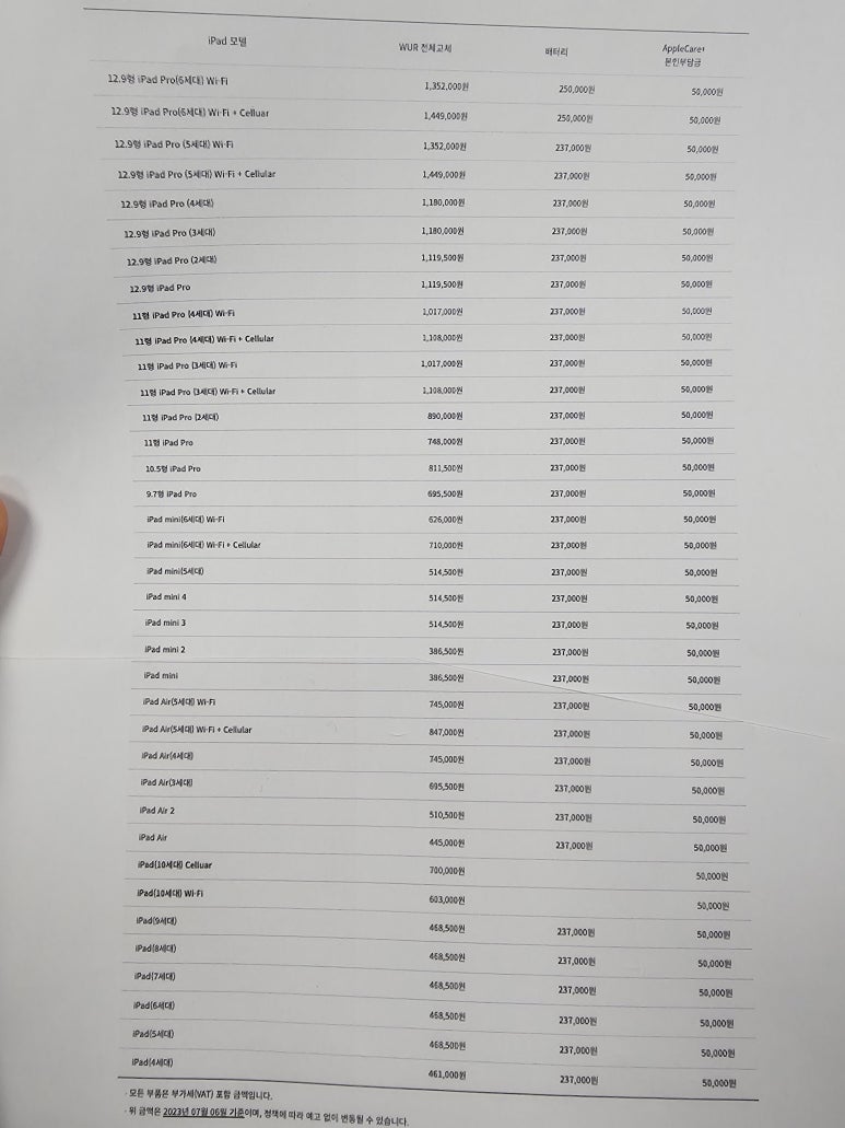 WUR 전체교체, 배터리, (애플케어)본인부담금
