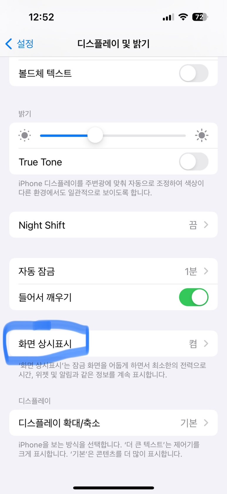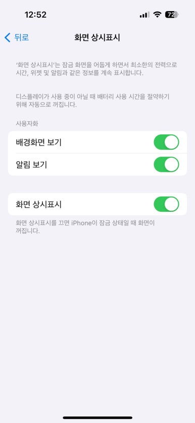 켜져있는 화면 상시표시를 눌러준다면