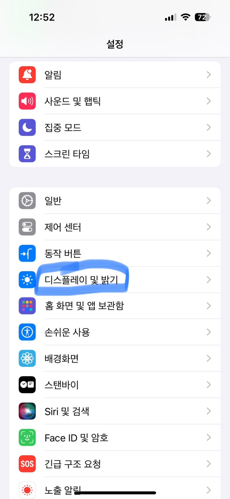 디스플레이 및 밝기를 눌러줍니다