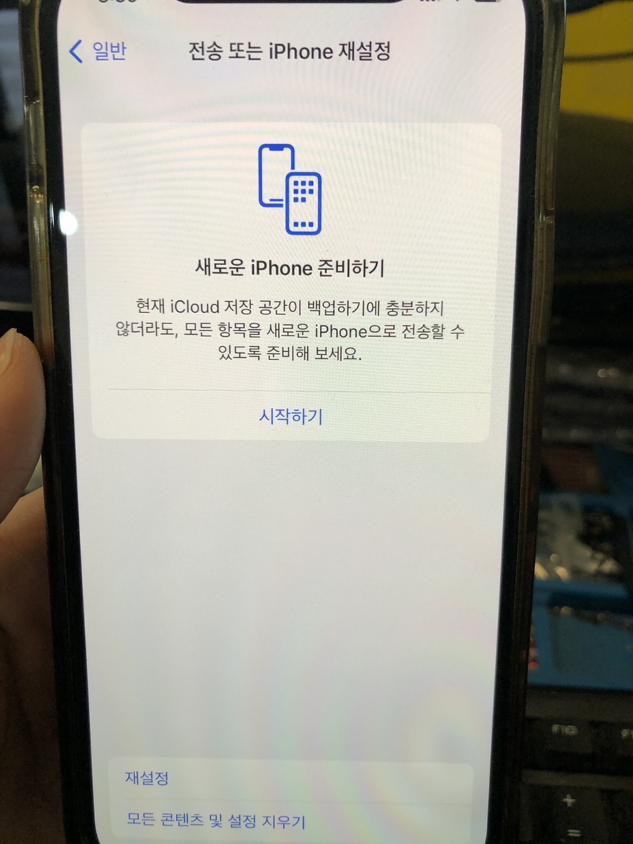 전송 또는 iphone 재설정에서 화면 하단에 있는 재설정 메뉴와 모든 콘텐츠 및 설정 지우기 메뉴중 첫번째 메뉴인 재설정을 선택해 주세요!