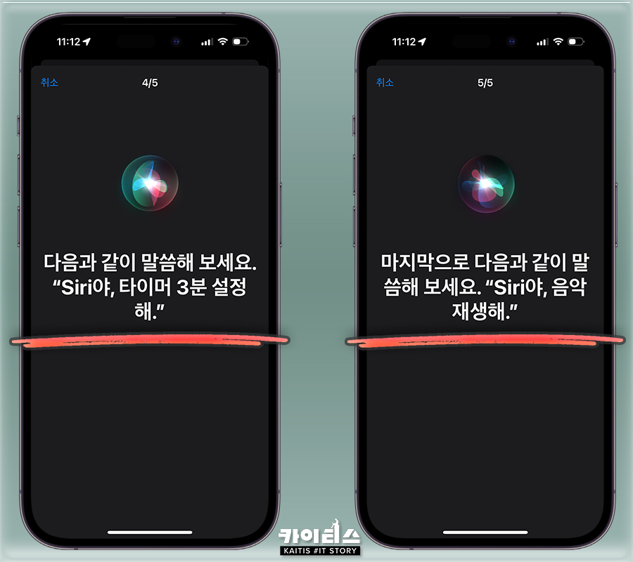 "Siri야" 듣기를 활성화 하면 총 5단계를 거쳐서 설정을 진행한다. 1부터 5까지 아이폰 화면에서 시키는대로 음성으로 대답하면 된다.