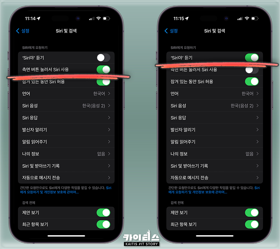 아이폰 시리 설정으로 음성 부르기 끄기, 켜기, 측면버튼 제어방법