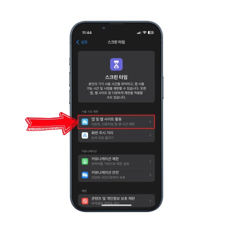 스크린 타임 항목으로 진입하셨다면, 자신의 핸드폰 일, 주 단위로 사용 분야와 시간이 화면에 표시되어 있으실 텐데요. 스크롤을 가장 아래로 내려 앱 및 웹 사이트 활동 끄기 항목을 찾아주세요.