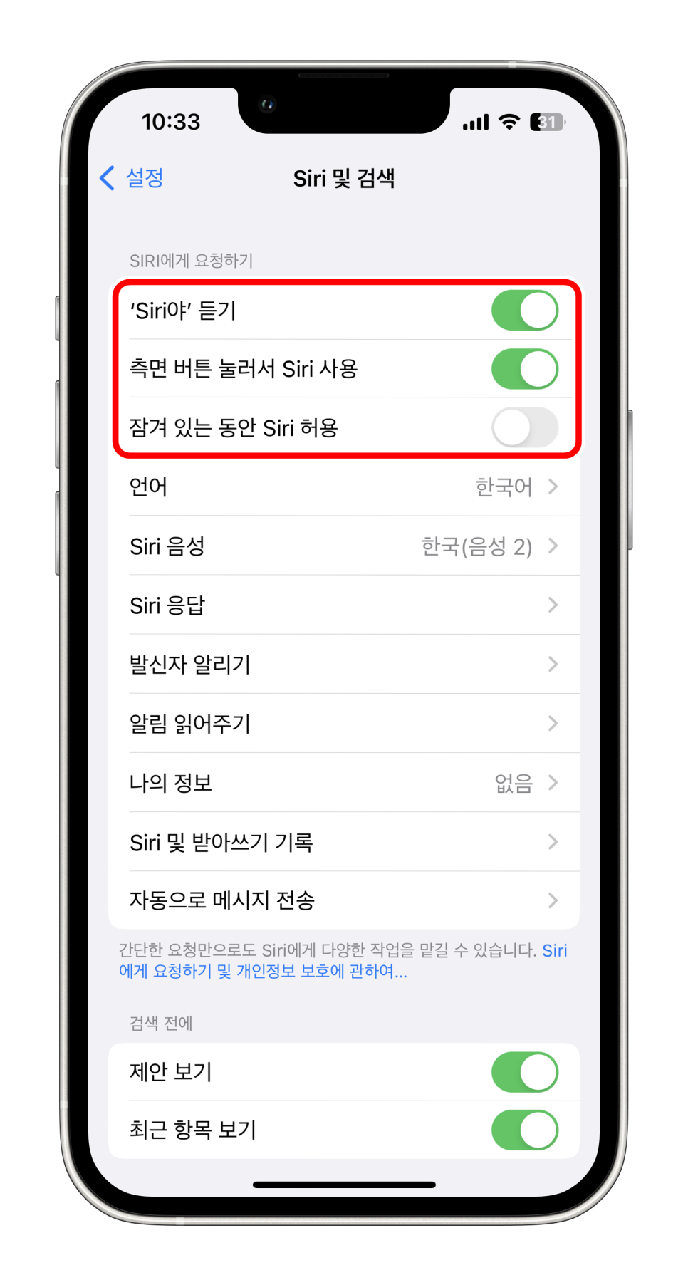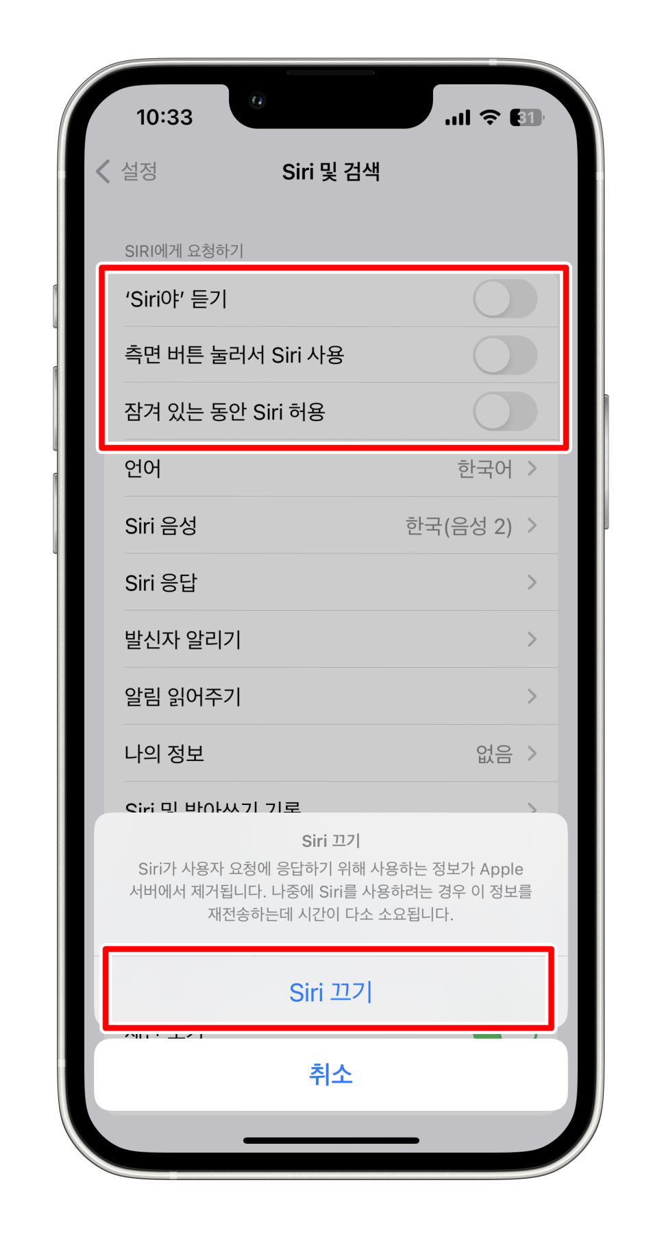 해당 버튼을 클릭하면 아이폰 시리야 부르기 끄기 설정이 진행됩니다.