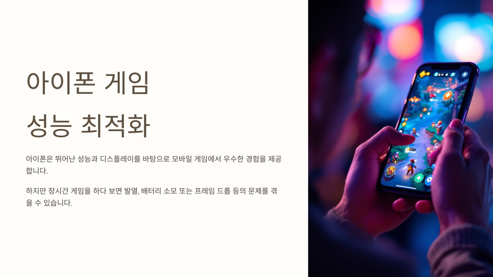 아이폰은 뛰어난 성능과 디스플레이를 바탕으로 모바일 게임에서 우수한 경험을 제공합니다. 하지만 장시간 게임을 하다 보면 발열, 배터리 소모 또는 프레임 드롭 등의 문제를 겪을 수 있습니다. 이번 글에서는 아이폰에서 게임 성능을 최적화하는 방법을 소개해, 더 부드럽고 쾌적한 게임 환경을 유지할 수 있도록 도와드립니다.