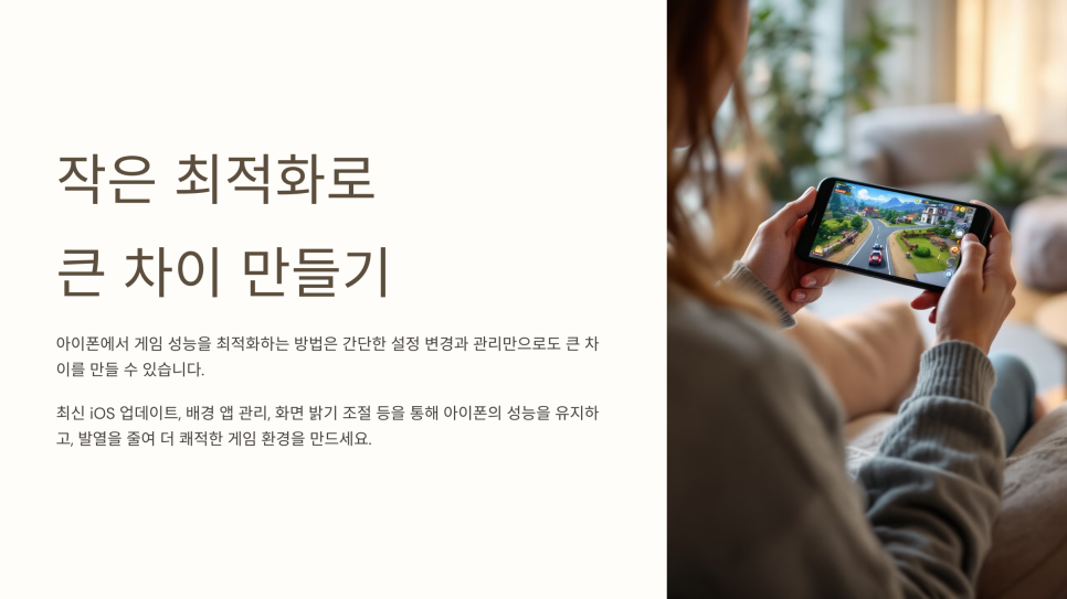 아이폰에서 게임 성능을 최적화하는 방법은 간단한 설정 변경과 관리만으로도 큰 차이를 만들 수 있습니다. 최신 iOS 업데이트, 배경 앱 관리, 화면 밝기 조절 등을 통해 아이폰의 성능을 유지하고, 발열을 줄여 더 쾌적한 게임 환경을 만드세요. 이러한 팁을 통해 최적의 성능을 경험하며, 아이폰에서 게임을 더욱 즐겁게 플레이할 수 있을 것입니다.