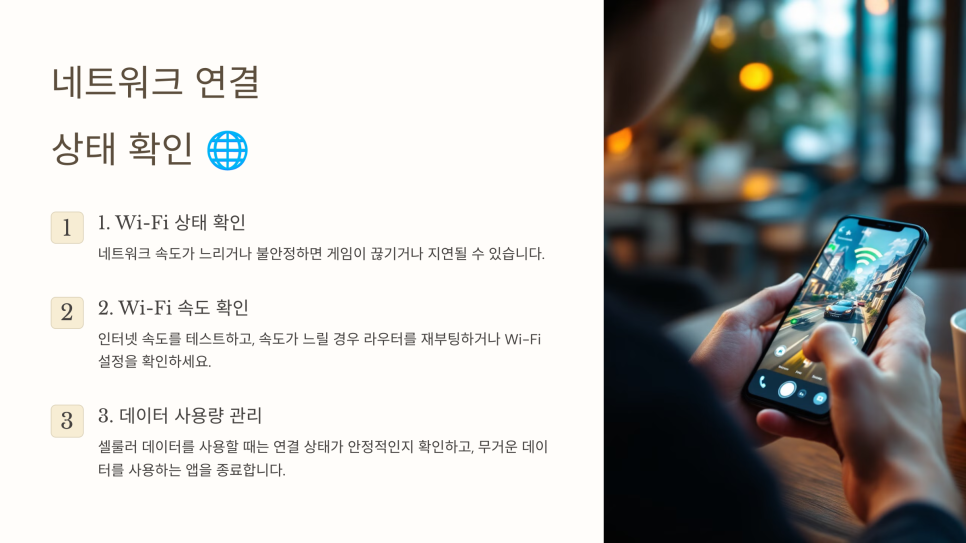 온라인 게임을 할 때는 네트워크 연결도 성능에 영향을 미칩니다. 네트워크 속도가 느리거나 불안정하면 게임이 끊기거나 지연될 수 있으므로, Wi-Fi 상태를 항상 체크하고 안정적인 네트워크를 사용하세요.