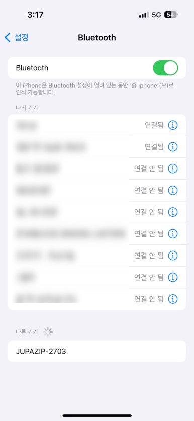 아이폰의 블루투스연결 화면에서 주파집을