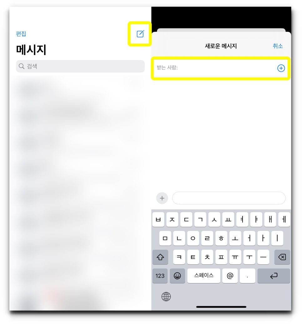 2. 메시지 앱이 실행되었다면, 우측 상단 노란색으로 표시해둔 보내기 아이콘을 클릭한다.