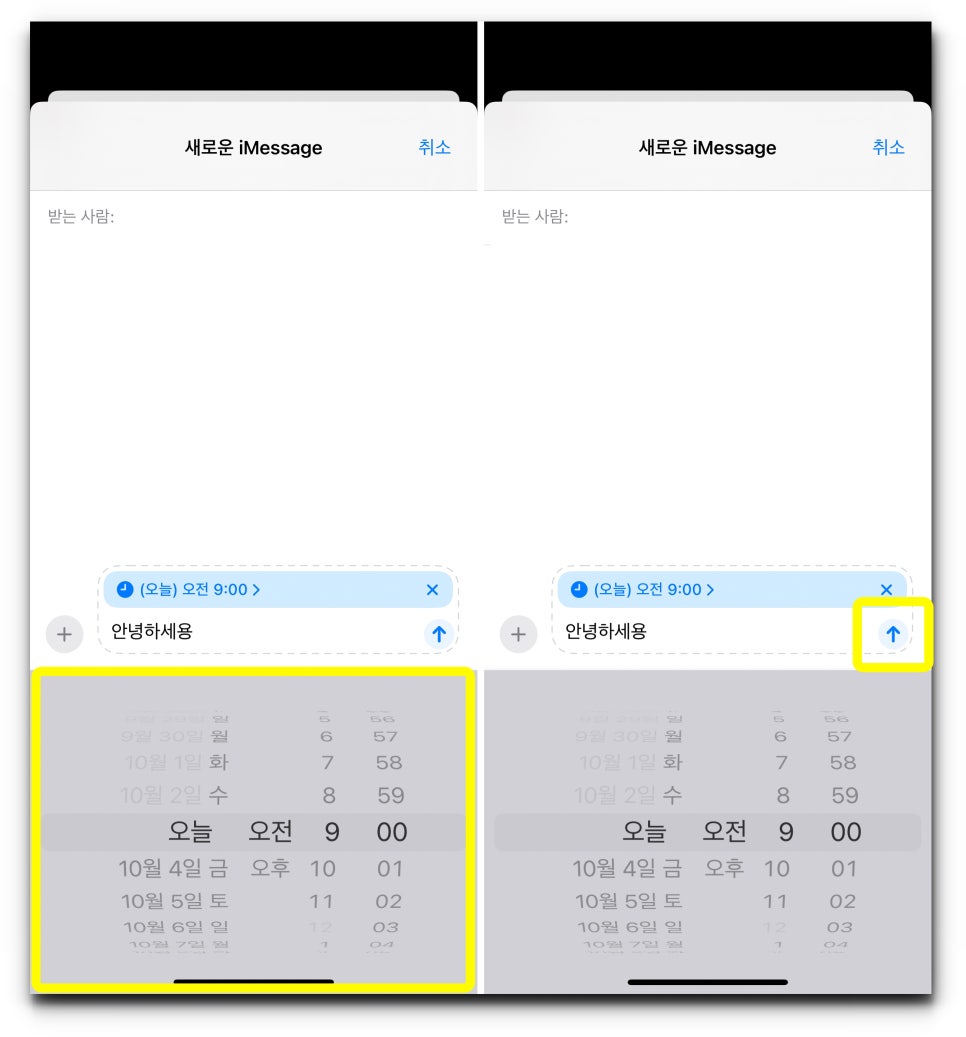8. 설정이 모두 완료되었다면, 노란색으로 표시해둔 보내기 버튼을 눌러준다. 그럼 아이폰 나중에 보내기 아이메세지 예약문자 보내는법이 모두 완료된다.