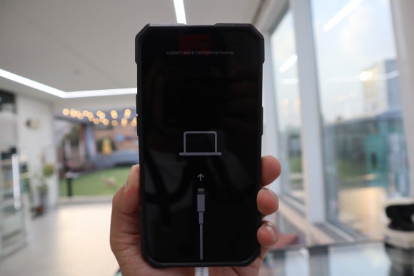 아이폰의 전원을 끄셨다면 위 사진에 보이는 해당 버튼을 누른 상태에서 데스크톱이나 랩톱에 연결합니다.