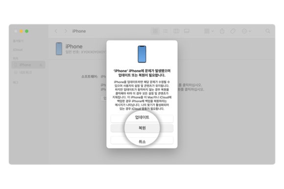 위 사진처럼 안내 문구와 함께 업데이트 및 복원 토글이 생성되었다면 성공입니다. 복원을 누르시면 내 아이폰의 초기화가 진행됩니다. 이때 알아두셔야 할 것은 나의 부주의 비밀번호 분실로 인한 초기화이기 때문에 기기의 모든 데이터가 초기화된다는 것인데요. 이것을 필히 숙지하시고 진행하시길 바랍니다!