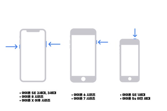 음량 버튼 및 잠금 버튼 동시 누르기 : 아이폰 SE 2세대 및 3세대, 아이폰 8 시리즈, 아이폰 X 이후 시리즈