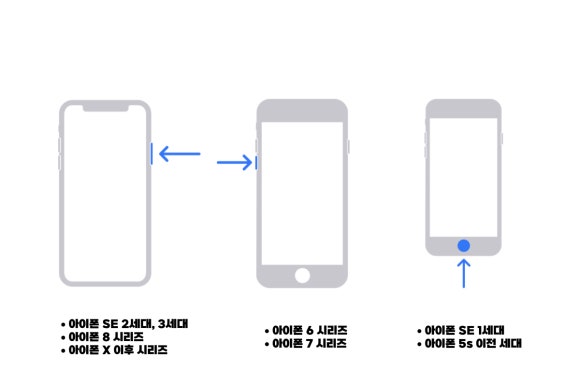 오른쪽 잠금 버튼 누르기 : 아이폰 SE 2세대 및 3세대, 아이폰 8 시리즈, 아이폰 X 이후 시리즈