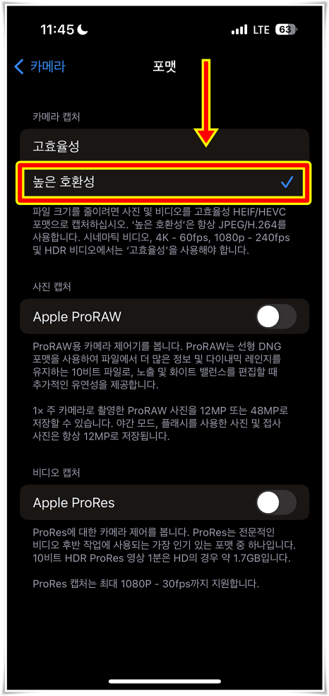 제가 살펴보았을 때는 아래쪽에 추가적인 설명글이 적혀있어서 친절하게도 도움말로 기능의 역할을 알게 되었는데요. 결론적으로, 고효율성은 크기를 줄이기 위한 용도이며, 높은 호환성은 항상 jpeg/H.264를 사용한다고 하였죠.