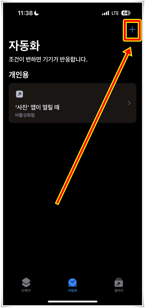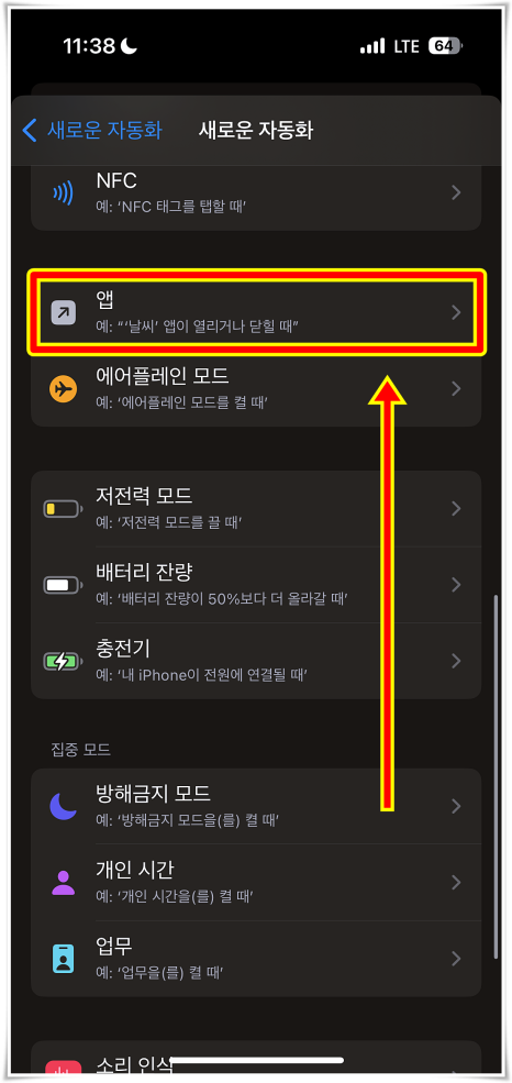 이후에 개인용 자동화 생성의 파란색 버튼을 눌러서 들어가주면 되었어요. 그리고 새로운 자동화에서 아래쪽으로 스크롤을 내리다 보면 앱이라는 카테고리가 보였는데 옆에 화살표를 눌러서 진입해 줬어요.