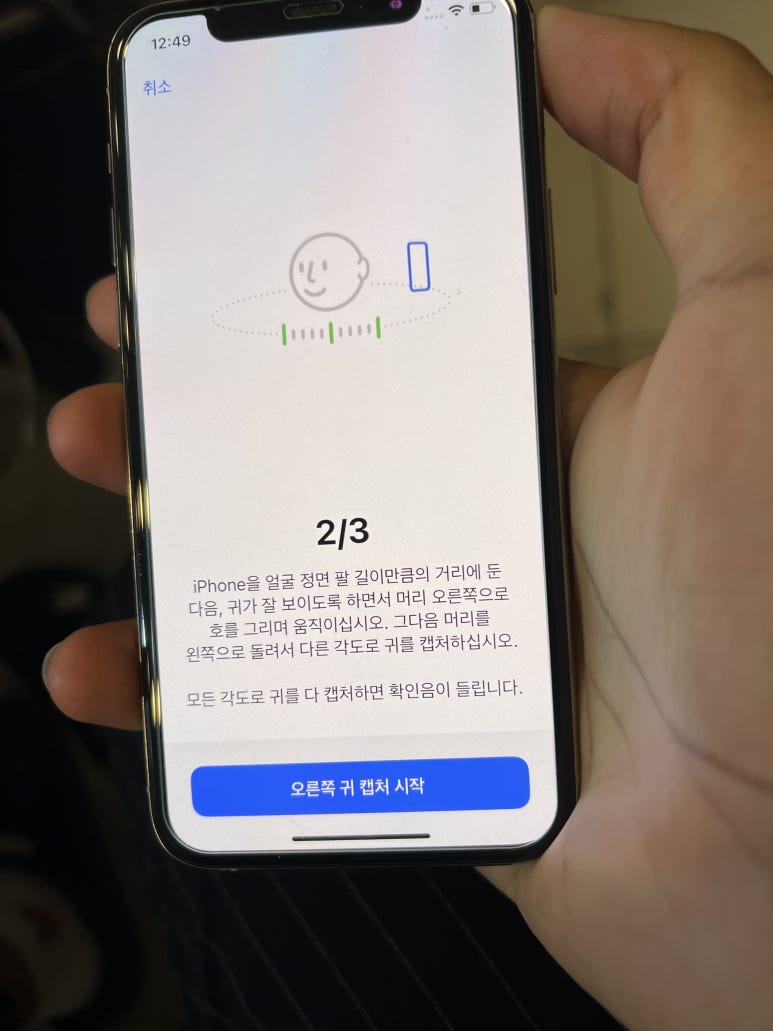 여기까지 진입하셨다면 나머지는 간단합니다 일단 얼굴을 인식시켜줘야하는데 페이스id를 등록할때처럼 캡처를 시작하고나서 얼굴의 다양한 각도가 나오도록 움직여주시면 됩니다 순서대로 얼굴> 오른쪽귀 > 왼쪽귀 이렇게 인식시켜줄거에요