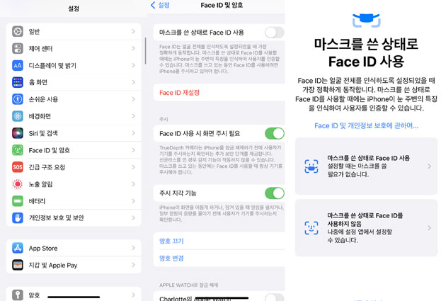 설정> Face ID 및 암호> 마스크를 쓴 상태로 Face ID사용 활성화> 아이폰 페이스 아이디 인식 및 설정을 하면 마스크를 쓴 상태로도 페이스 아이디 인식이 됩니다.