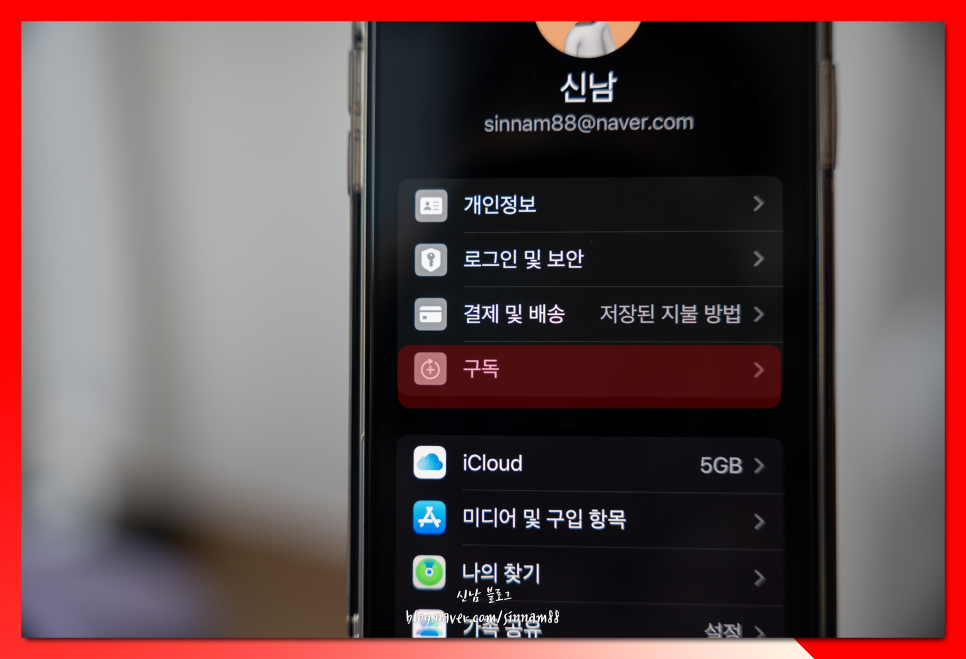 1. 위의 내용과 연결되는 겁니다. <애플 계정> 항목으로 들어오면 <구독> 이라는 곳이 있어요 눌러주도록 할게요.