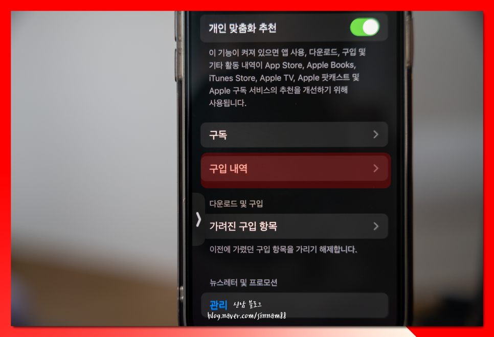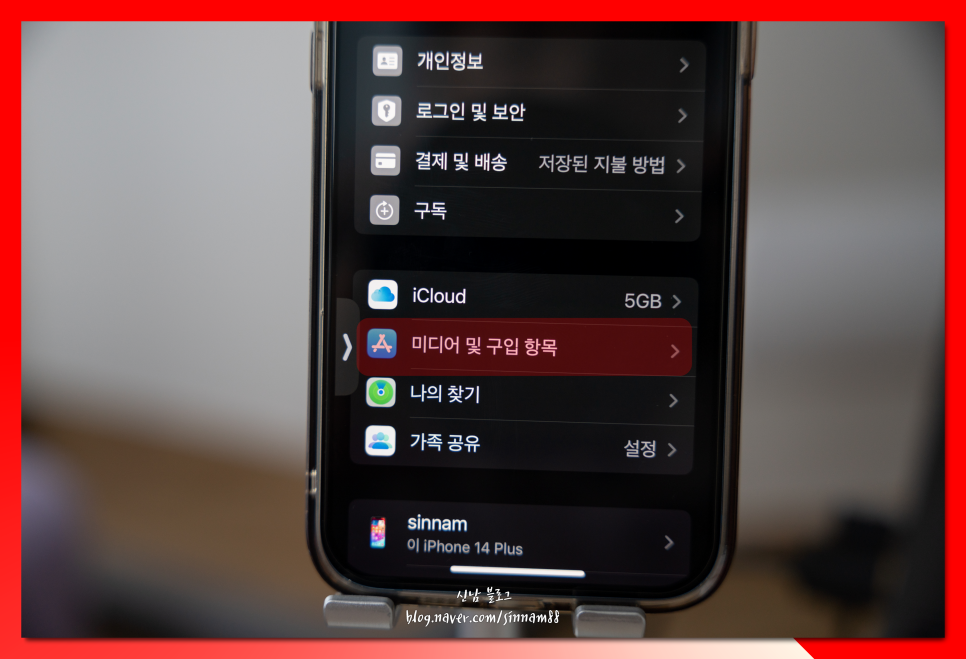 1. 마지막으로, <애플 계정> 항목에서 <미디어 및 구입 항목>이라는 곳을 들어가주세요.