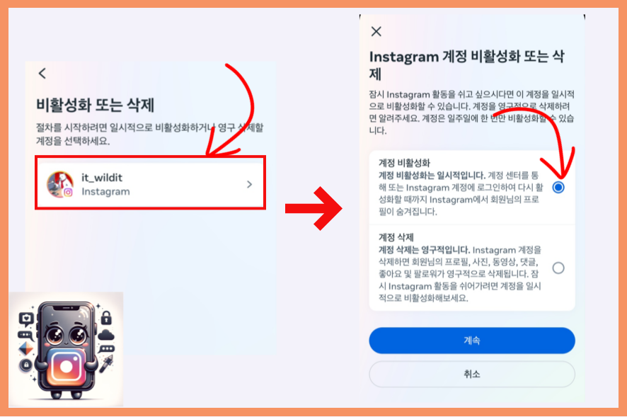 비활할 인스타 아이디를 골라주시고, "계정 비활성화"에 체크해 주세요. 그리고 파란색 "계속" 버튼 눌러줍니다