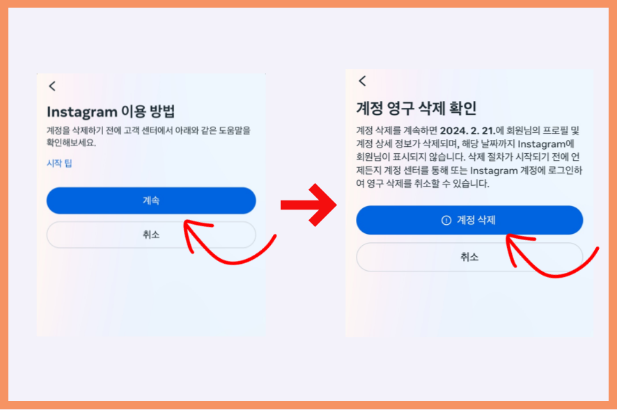계속을 한 번 더 눌러주시고, 마지막으로 "계정 삭제"를 눌러주시면 계정이 최종적으로 삭제됩니다.