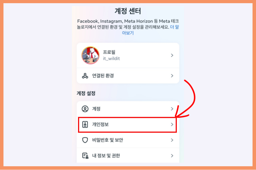 "설정 및 개인정보"에서 "계정센터" 로 이동합니다