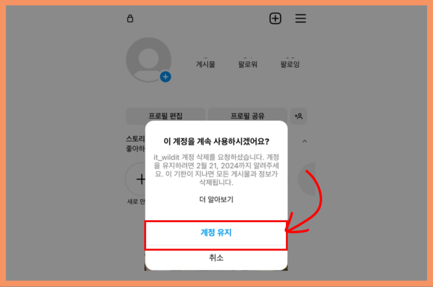 삭제한 아이디로 인스타에 로그인을 해주세요. "계정 유지"를 선택하면, 계정 복구 완료입니다.