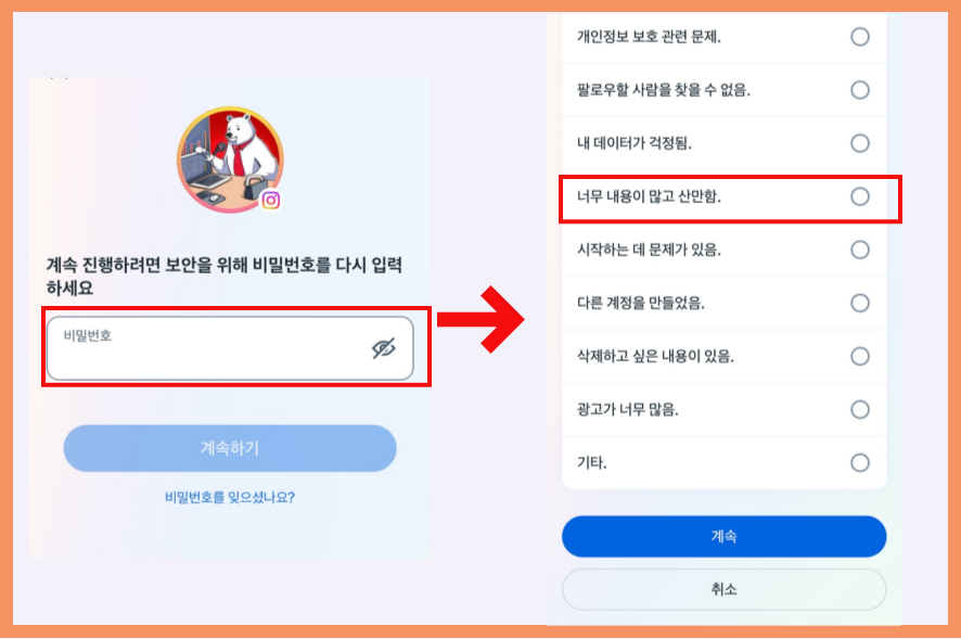 다음 단계로는 본인 인증을 위해 비밀번호를 입력해야 합니다. 그리고 비활 이유를 선택하는 단계인데요, 아무거나 선택해 주시면 됩니다. 그리고 "계속"