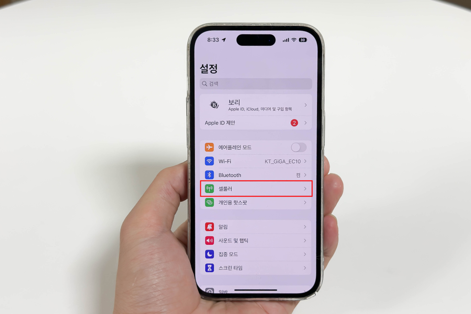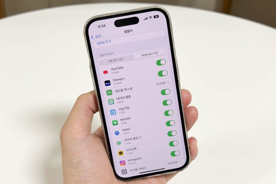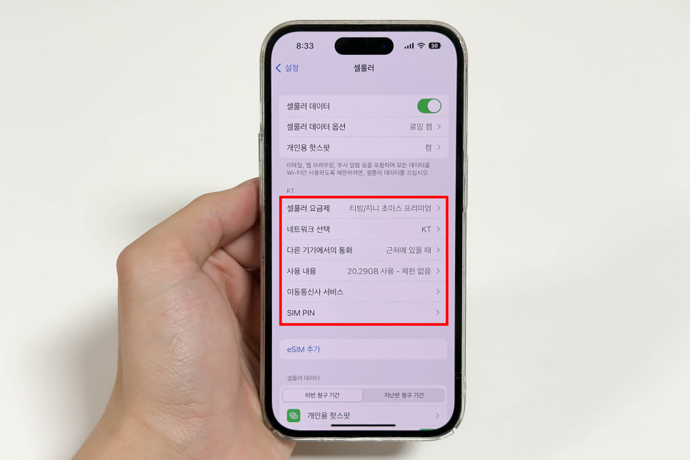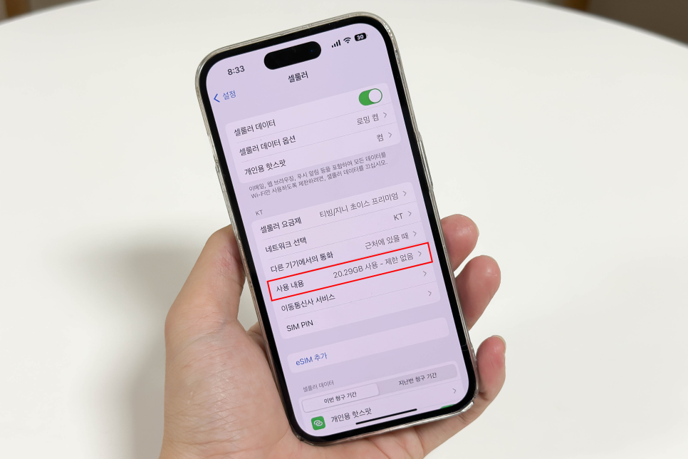 설정으로 들어왔다면, 현재 이용 중인 셀룰러 요금제와 사용 내역을 간단하게 확인할 수 있습니다. 예를 들어 필자는 KT의 '티빙/지니 초이스 프리미엄' 요금제를 사용하고 있고, 이번 달은 20.29GB의 데이터를 사용했네요.