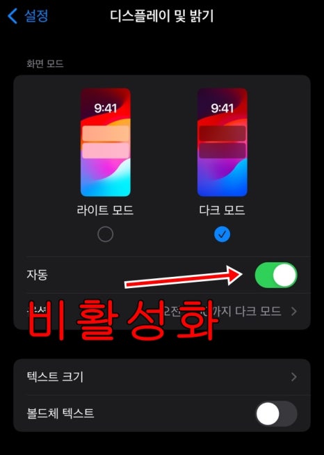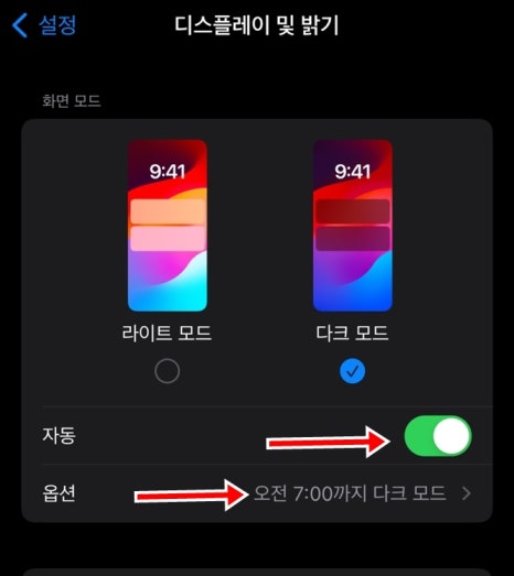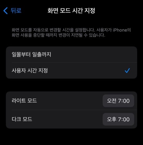 네 번째, 다크 모드 설정 후 자동을 활성 하하셨다면
