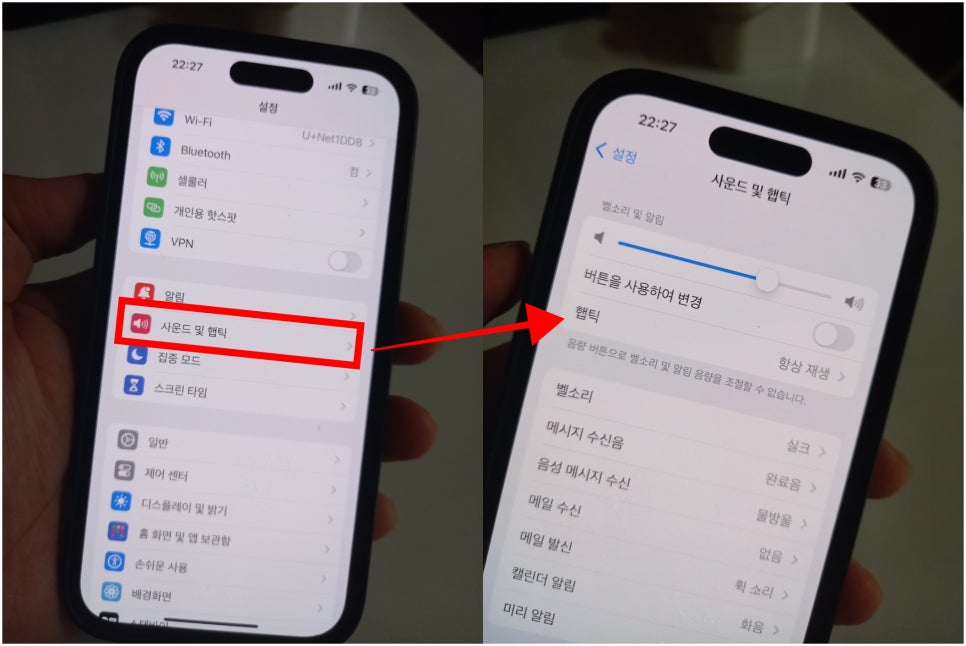 1. 설정 -> 사운드 및 햅틱 모드로 들어가서 햅틱 메뉴를 클릭해 줍니다.