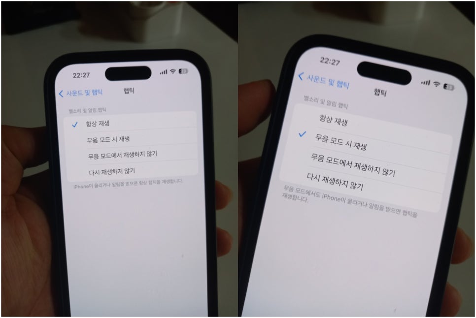- 무음 모드 시 재생 : 무음 모드에서도 아이폰이 울리거나 알림을 받으면 햅틱이 재생됩니다.