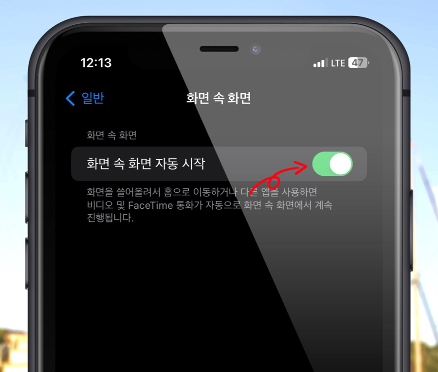 그런 다음 '화면 속 화면 자동 시작' 버튼을 활성화해주시면 기본 설정은 끝입니다. 참고로 IOS 최선 버전으로 업데이트하지 않았다면, 정상적으로 작동이 안 될 수도 있으니 되도록 최신 버전으로 업데이트하시기 바랍니다.