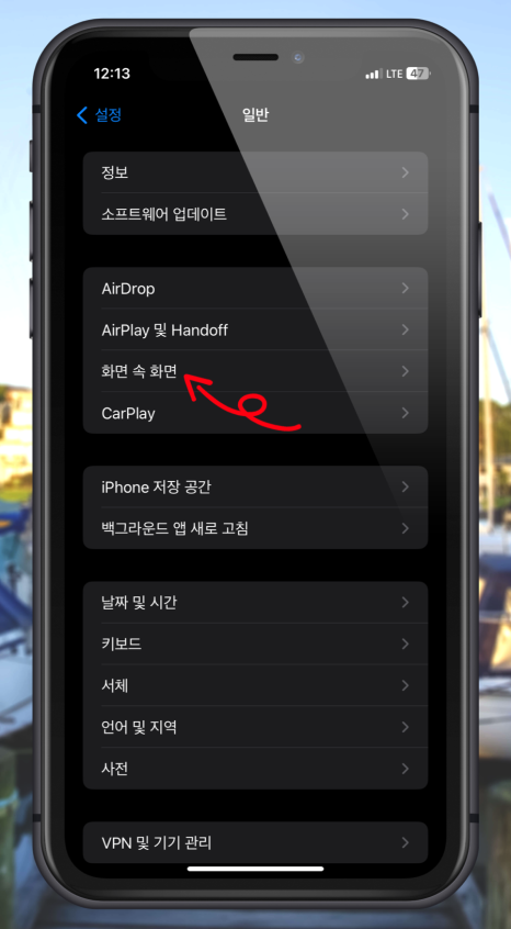 분활화면 기능을 사용하기 위해서는 기본적인 설정을 해야 합니다. 먼저 설정 앱에서 일반 탭으로 이동하신 후, '화면 속 화면' 항목을 클릭해 주세요.