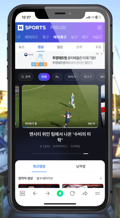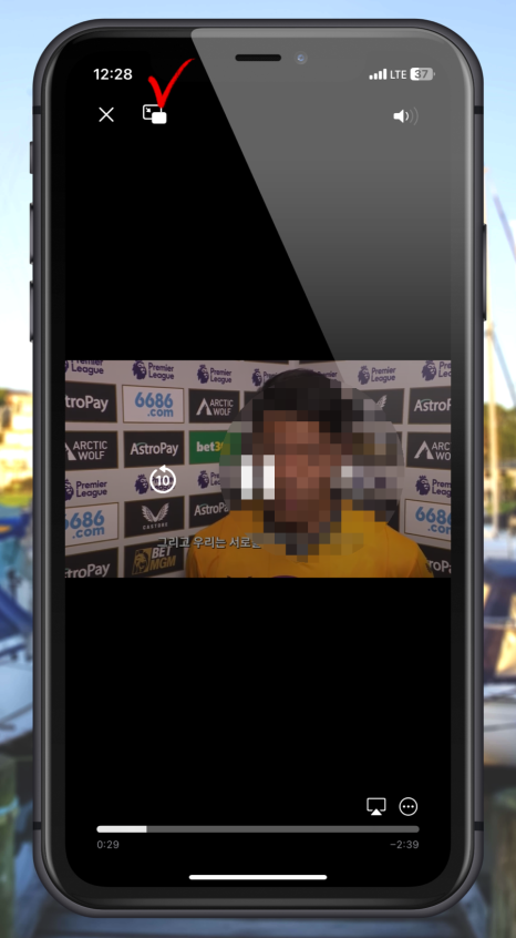 그럼 유튜브 프리미엄 구독자가 아닌 사람들은 분할화면을 사용할 수 없는 걸까요? 아닙니다. 다른 앱에서는 사용 가능합니다. 저는 스포츠뉴스 또는 해외 축구 영상을 많이 시청하는데요. 보고 싶은 동영상을 전체 화면으로 전환한 뒤 상단에 '사각형' 아이콘을 클릭하시면 PIP 모드로 전환됩니다.