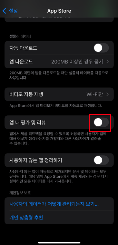 3. 하단의 앱 내 평가 및 리뷰 옵션을 찾아 끈다. 이렇게 하면 모든 앱에서 자동으로 리뷰 요청 팝업이 더 이상 나타나지 않게 된다.