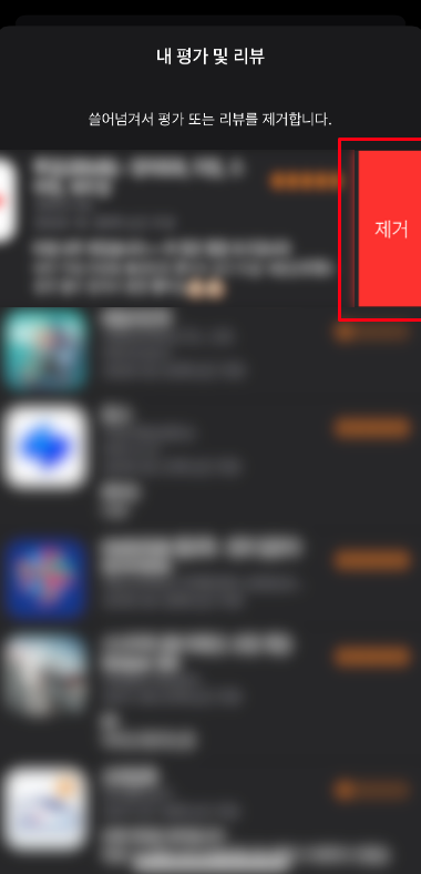 6. 삭제하고 싶은 리뷰를 왼쪽으로 밀면 삭제 버튼이 나오는데, 삭제 버튼을 클릭하면 리뷰가 삭제된다.