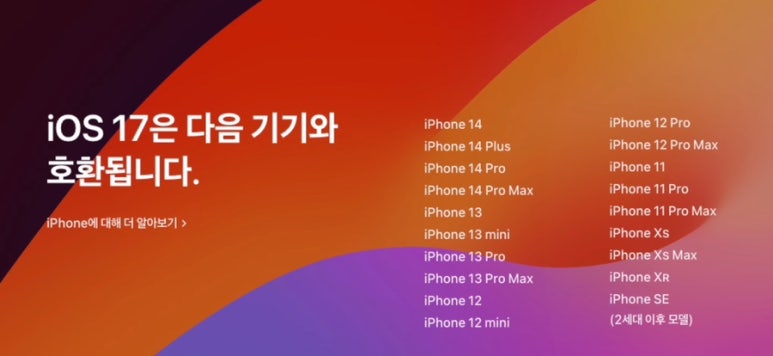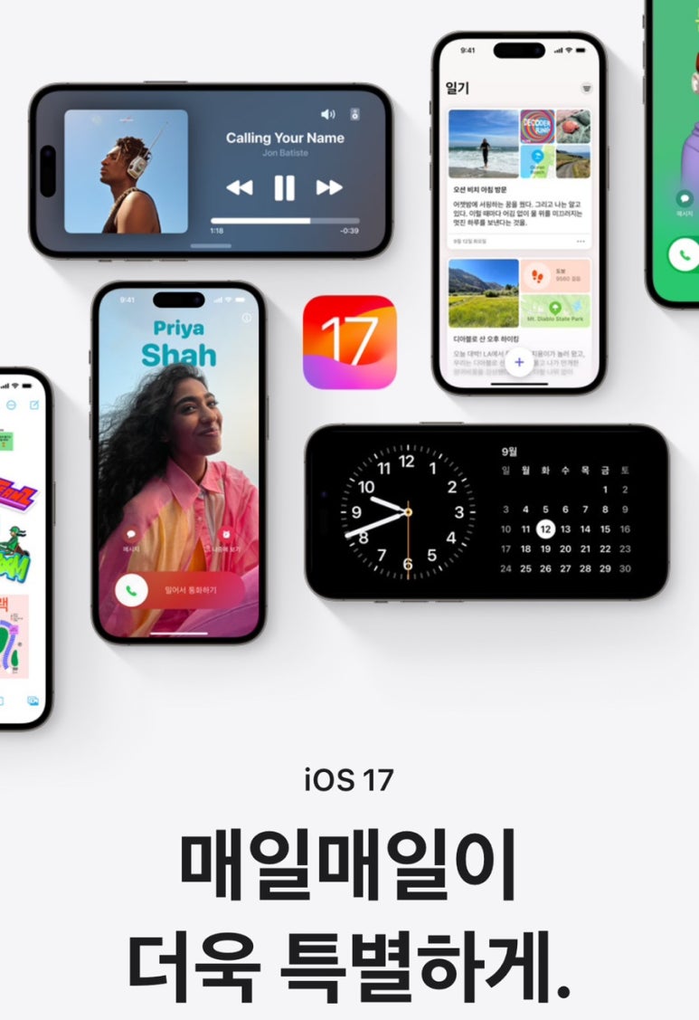 다채로운 신기능이 가득한 iOS 17. 당신의 개성을 듬뿍 담아 소통하고, 보다 편리하게 콘텐츠를 공유하고, iPhone 전체 화면을 완전히 새로운 방식으로 활용할 수 있게 해줍니다.